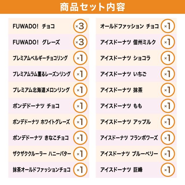 | 原材料名 | 【FUWADO!チョコ】 ミックス粉(小麦粉、砂糖、ショートニング、その他)(国内製造)、チョコレートコーチング(植物油脂、砂 糖、乳糖、ココアパウダー)、食用油脂、ヨーグルト、パン酵母、クリーム、発酵種粉末、うるち米パウ ダー/乳化剤、ベーキングパウダー、香料、(一部に小麦・卵・乳成分・大豆を含む) 【FUWADO!グレーズ】 ミックス粉(小麦粉、砂糖、ショートニング、その他)(国内製造)、食用油脂、油脂加工食品(砂糖、植 物油脂、デキストリン)、ヨーグルト、パン酵母、ショートニング、クリーム、発酵種粉末、うるち米パウ ダー/乳化剤、ベーキングパウダー、香料、(一部に小麦・乳成分・卵・大豆を含む) 【オールドファッションチョコ】 ミックス粉(小麦粉、砂糖、植物性たん白、その他)(国内製造)、食用油脂、チョコレートコーチング(植物油脂、砂糖、乳糖、ココアパウダー)、鶏卵/ベーキングパウダー、乳化剤(大豆由来)、香料、着色料(アナトー、V.B₂) 【ポンデドーナツチョコ】 ミックス粉(小麦粉、砂糖、ショートニング、粉末油脂、その他)(国内製造)、食用油脂、チョコレートコーチング(植物油脂、砂糖、乳糖コアパウダー)、鶏卵/加工デンプン、ベーキングパウダー、乳化剤(大豆由来)、香料 【ポンデドーナツホワイトグレーズ】 ミックス粉(小麦粉、砂糖、ショートニング、粉末油脂、その他)(国内製造)、食用油脂、油脂加工食品(砂糖、植物油脂、デキストリン)、鶏卵/加工デンプン、ベーキングパウダー、乳化剤、香料、(一部に小麦・乳成分・卵・大豆を含む) 【ポンデドーナツきなこチョコ】 ミックス粉(小麦粉、砂糖、ショートニング、粉末油脂、その他)(国内製造)、食用油脂、チョコレートコーチング(植物油脂、砂糖、乳糖、きなこ(大豆を含む)、その他)、鶏卵、砂糖、きなこ/加工デンプン、ベーキングパウダー、乳化剤、香料 【抹茶オールドファッションチョコ】 ミックス粉(小麦粉、砂糖、植物性たん白(大豆を含む)、その他)(国内製造)、食用油脂、チョコレートコーチング(植物油脂、砂糖、乳糖、ココアパウダー)、鶏卵、抹茶/ベーキングパウダー、乳化剤、香料、着色料(アナトー、V.B₂) 【ザクザククルーラーハニーバター】 小麦粉(国内製造)、食用油脂、砂糖、油脂加工食品(砂糖、植物油脂、デキストリン)、全卵、牛乳、マーガリン、乳等を主要原料とする食品、蜂蜜、濃縮レモン果汁、食塩、発酵バター/乳化剤(大豆由来)、ベーキングパウダー、香料、V.C、着色料(カロチン) 【プレミアムベルギーチョコリング】 小麦粉(小麦(国産))、チョコレートコーチング(植物油脂、砂糖、乳糖、ココアパウダー)、食用油脂、砂糖、全卵、牛乳、ココアパウダー、水あめ、カカオ豆、チョコレート、マーガリン、食塩/トレハロース、ベーキングパウダー、香料、乳化剤(大豆由来)、クエン酸鉄、着色料(カロチン) 【プレミアム北海道メロンリング】 小麦粉(小麦(国産))、油脂加工食品(植物油脂、砂糖、脱脂粉乳)、食用油脂、砂糖、全卵、メロンピューレ、水あめ、マーガリン、牛乳、クリーム、レモン果汁、食塩/ベーキングパウダー、香料、乳化剤(大豆由来)、着色料(カロチノイド) 【プレミアム ラム薫るレーズンリング】 小麦粉(小麦(国産))、油脂加工食品(植物油脂、砂糖、脱脂粉乳)、食用油脂、砂糖、全卵、牛乳、果実加工品(レーズン、砂糖)、マーガリン、カラメルソース、クリーム、食塩/ベーキングパウダー、香料、乳化剤(大豆由来)、ユッカ抽出物、着色料(カロチン) |